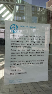 Here we are less than 2 years since Macy's closed at the mall. As of January 30, 2014 the rest of the interior of the mall is now closed to the public. This is a mega-post with the history, store lists, photos, and possible future plans for the mall site. Several notable events occurred to bring the mall to the closing point. October-December 2005- JCPenney pulls out and opens at Baybrook Mall. September 2008- Dillard's is damaged by Hurricane Ike and is subsequently closed. FEMA moved into the Dillard's for two years. January- March 2012- Macy's closes at the mall. January 7, 2013- Half of the mall (End of the food court to Dillard's) is sealed off to the public. November 2013- The rest of the interior of the mall closed on January 30, 2014 two days earlier than the original closure date of Feb 1st. Palais Royal, Cinemark, Affordable Furniture, and Sears will remain open for now. Several photo sets will show the decline of the mall from January 2012 through January 2014. The closure of Macy's and the opening of the nearby Tanger Outlets was the tipping point that sealed the fate of Mall of the Mainland. I made purchases on each trip to the mall, but there needed to be more support to keep this mall alive.