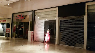 A spooky advertisement for the boutique at the end of the former Macy's corridor.
